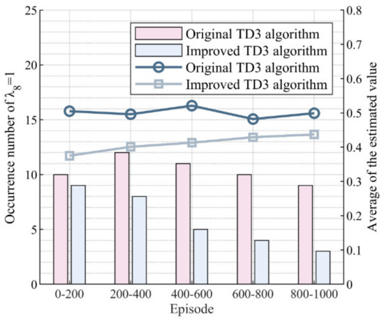 Improvement effect of the TD3 algorithm. The values of the bar indicate the number of occurrences of per 200 episodes, while the values of the line indicate the average of the estimated value every 200 episodes.