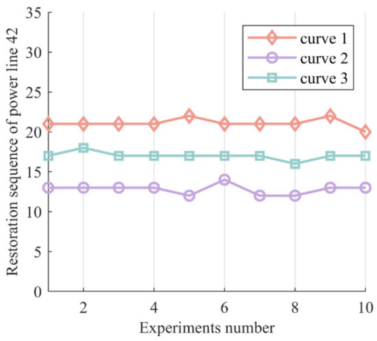 To validate the impact of uncertainties on the restoration sequence, we take the restoration sequence of power line 42 as an example to observe the change of its restoration sequence, and the results are shown in Figure 8. We can observe that in the case corresponding to curve 3, the restoration sequence of power line 42 in 10 experiments was approximately the 17th step, which differs from the cases corresponding to curves 1 and 2. This indicates that uncertainties during the restoration process can alter the restoration sequence and should not be ignored in the practical restoration process.
