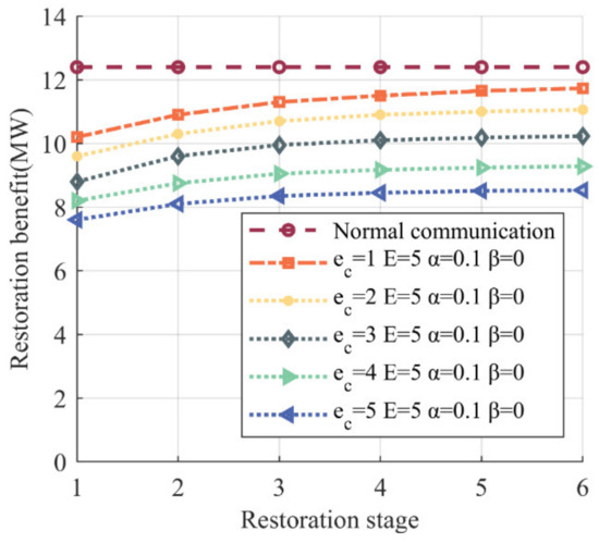 Specifically, we assume that DoS attackers send a significant volume of disguised packets to information nodes 31, 32, 33, and 34, resulting in their infection. As a result, the communication channels within the coupling layer connected to the information nodes and the communication links within the information network of the control layer become blocked. When communication delays are detected, the technical staff at the control center suspend the restoration of power grid faults and initiate the deployment of firewalls and intrusion detection systems to restore the communication faults. Equation (25) demonstrates that the impact of communication delays on restoration benefit depends on its occurrence timing and restoration speed. To facilitate the statistical analysis, the occurrence time of communication delays is divided into six stages: stage 1: 1 to 6 steps; stage 2: 7 to 12 steps; stage 3: 13 to 18 steps; stage 4: 19 to 24 steps; stage 5: 25 to 30 steps; and stage 6: more than 30 steps. We set , with corresponding to the first stage, corresponding to the second stage, etc. There are five levels of restoration speed: level 1: ; level 2: ; level 3: ; level 4: ; and level 5: . Among them, indicates that the restoration of communication delay requires one step, requires two steps, etc. We set and . The remaining experimental parameters are maintained in accordance with the previous section. The simulation results are shown as follows.