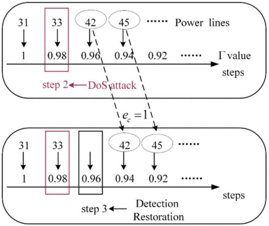 Mechanism of the value reduction. We assume that a DoS attack is launched against the information node at step 2. It can be observed that the DoS attack has no impact on the restoration of steps 2 and 1. As the restoration process reaches step 3, the control center performs a status check and detects the communication delay, initiating its restoration. Power line 42 cannot be restored in step 3, and its recovery order is changed from step 3 to step 4. The reason it is changed to step 4, rather than step 5, step 6, etc., is because . Similarly, the restoration step for power line 45 transitions from step 4 to step 5, etc. At step 4, regardless of whether power lines 45 or 42 are restored, the value corresponding to step 4 remains unchanged. When power line 42 is restored at step 4, the value reduces from 0.96 (corresponding to step 3) to 0.94. The above analysis explains the reduction of the value.