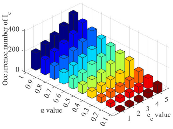 The average occurrence number of for the five restoration speeds under each value in Figure 11 is calculated to represent the actual policy bias under the normal restoration speed. The results are shown in Table 5, where the difference ratio indicates the percentage reduction in the average occurrence number of for the next value compared to the current value. For instance, when the value of changed from 1 to 0.9, the average occurrence number of reduced by 11.29%, resulting in a difference ratio of 11.29%. We can observe that as the value of reduced from 1, the difference ratio increased continuously. When the value of changed from 0.4 to 0.3, the difference ratio reached its maximum value of 24.38%, and as the value of continued to reduce, the difference ratio also reduced. This indicates that under the condition of , the optimal range of value for minimizing the difference between and was around 0.3, leading to a more effective improvement in solving the problem of policy bias.