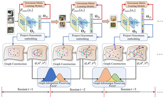 In incremental learning sessions, it is crucial to not only focus on learning new knowledge but also mitigate the issue of catastrophic forgetting. To address this issue, we designed the Graph Information Preserving (GIP) module to preserve the adjacency relationships among previously learned classes, thus preventing the network from forgetting the knowledge it has learned. Specifically, we embed network parameters onto the Grassmann manifold by an orthogonalization method. This approach allows for a better description of the properties of the parameter’s linear subspace while preserving the learned knowledge, ultimately enhancing adaptability to new classes with few shot samples. At each learning stage t, we utilize the metrics of the Grassmann manifold to construct a neighborhood graph that describes the adjacency relationships among the learned classes. Here, represents the adjacency weights, and represents class centers. The neighborhood graph depicts the correlations between learned classes and dynamically update on the Grassmann manifold. Subsequently, we employ information entropy to maintain the structural relationships with the neighborhood graph , further preserving the adjacency relationships among the previously learned classes, thus alleviating the problem of catastrophic forgetting. Therefore, this method proves viable throughout the incremental learning process, as it concurrently preserves both geometric characteristics and structural relationships.