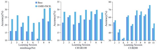 To assess the effectiveness of GMIE-FSCIL in learning knowledge about new classes, we display the new class accuracy of both the baseline and GMIE-FSCIL framework at each session of incremental learning in Figure 6. The experimental results unequivocally show that, in comparison to the baseline, our GMIE-FSCIL consistently achieves substantial improvements in new class learning accuracy at every session during the incremental learning process. This indicates that within GMIE-FSCIL, the Grassmann Metric Learning module effectively maintains the geometric attributes of the samples, reduces the risk of overfitting, and enhances adaptability to new classes. Meanwhile, the Graph Information Preserving module adeptly preserves knowledge pertaining to new classes. These findings strongly affirm the superior performance of GMIE-FSCIL in efficiently learning new knowledge and mitigating catastrophic forgetting.