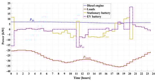 Energy presents a critical global challenge at the present time. The depletion of fossil fuels, rising energy demand, and escalating pollution levels have underscored the need for energy regulation and the diversification of energy production. Microgrids (MGs) have emerged as a response to the expansion of renewable energy sources (RESs) and the increasing prevalence of controlled loads [1]. The high integration of RESs into the power grid is considered a promising alternative to traditional energy sources. However, this integration has raised concerns regarding system stability, highlighting the necessity for enhanced management, control, monitoring, power electronics converters, and design approaches [2,3,4]. MGs can operate in two modes: isolated mode and grid-connected mode [5,6]. In the isolated mode of MGs, it is often necessary to implement advanced control techniques in order to handle sudden variations in load as well as ensure frequency regulation and stable performance [7,8]. Furthermore, an energy storage system (ESS) is a crucial component of MGs, helping to minimize frequency variations and serving as a reserve storage or buffer zone in response to fluctuations in load [9,10]. The widespread adoption of RESs in some regions may result in local overload, which can be addressed through an energy management system (EMS). In addition, the vehicle-to-grid (V2G) concept involves the use of electric vehicles’ (EVs) batteries to cover shortfalls in power supply when RESs are not operating at their planned output [11]. This makes EVs useful as mobile energy storage systems that can provide auxiliary services to MG. Managing and optimizing MGs that include dynamic components like EVs is a challenge. Although previous studies have optimized energy management systems for MGs, they have not yet considered the presence of EVs [12]. Hence, the goal of our study is to design and control an efficient energy management system for MGs including RESs, ESS, and EVs with V2G.