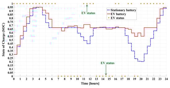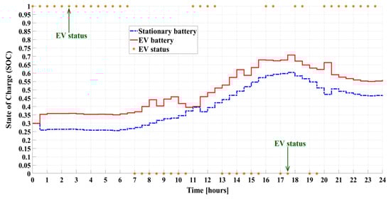 In this research, the EV part in the MG system is considered as a mobility battery storage. For simplicity, the built-in battery of the EV only can discharge the power to the MG system or be charged from the system when it is at home with a charging terminal, i.e., EV(t) = 1. Moreover, the types of the stationary battery in the system and the EV’s built-in battery are assumed to be the same type.