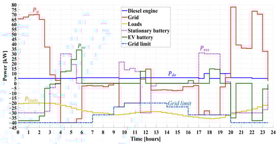 On the other hand, when the MG is connected to the national power grid, the energy system can be designed with a larger capacity for renewable power than its load capacity. The excess energy can then be sold back to the national grid, and diesel engines only operate during times of high electricity prices for the purpose of selling electricity at the most favorable price. Additionally, the amount of electricity transferred to the national power grid can be appropriately limited during times of excess energy, which can be stored in stationary batteries and built-in batteries of EVs for later use or sale with consideration of safe SOC ranges of the batteries. This approach optimizes the total power from renewable energy sources to benefit the other components in the designed system, thus the results are not greatly influenced by whether the solar or wind energy is dominant.