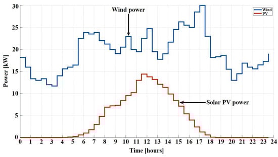 The power profiles of wind and solar energy over the course of a single day are shown in Figure 10. Wind energy is depicted as being accessible throughout the entire day, whereas solar energy is limited to daylight hours when sunlight is available.