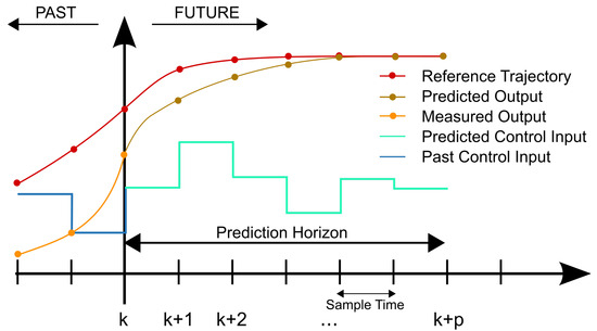 Equation (21) formulates the tracking error cost function as the total weighted sum of the squares of the differences between the reference and the predicted output at each step from the present to the prediction horizon. This error’s relevance in the cost function amplifies with the assigned weight, resulting in more aggressive controllers with higher weights but at the price of increased control efforts.