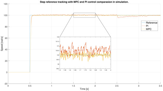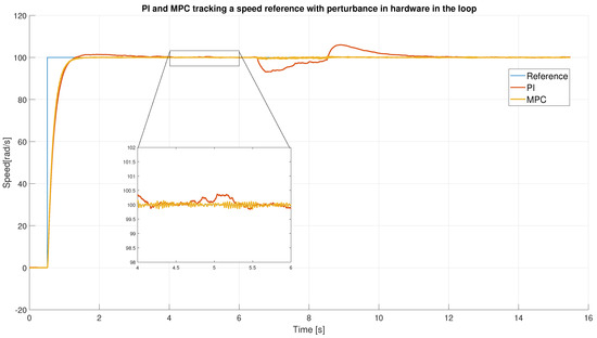 It should be noted that the improvement in the MPC’s performance is not remarkable in the area of battery reduction. This is due to the lack of use of any battery management techniques, as used by the authors of [41]. The only improvement in the MPC over the PI in terms of battery usage is obtained because the MPC shows a smoother response, since it reaches the speed setpoint without overshoot, as seen in the previous experiments, and it shows a less noisy response in the stationary state.