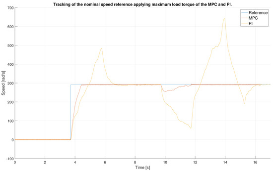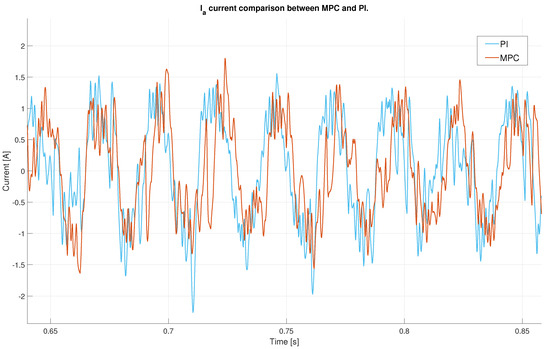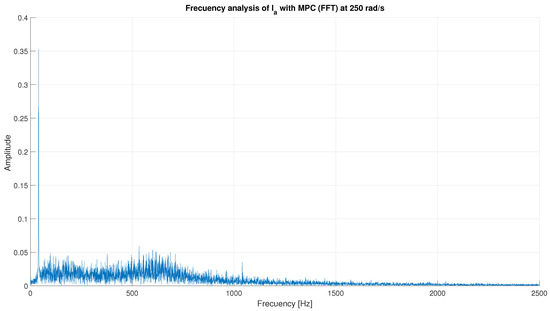These results indicate that the MPC achieves a more ideal signal in the motor currents, which is consistent with the total harmonic distortion (THD) values observed in Table 9. In this table, several reference speed cases are presented, in which the MPC also achieves smaller THD values. It is worth mentioning that, at higher speeds, the fundamental frequency is higher, and, as a result, the frequencies considered for THD calculation are higher. This leads to a higher resultant THD value when considering the lower amplitude of the first harmonics compared to those at higher frequencies, as shown in the frequency analysis above. Nonetheless, the improvement percentage of the MPC remains consistent in all three cases, ranging between 40% and 65%.