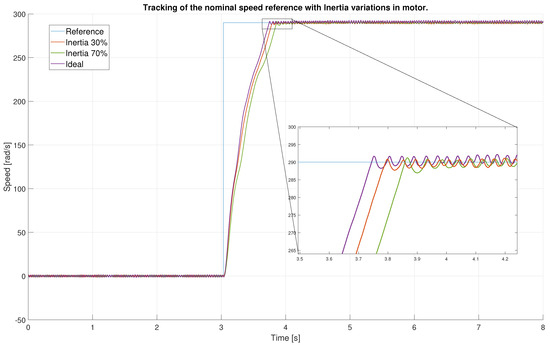 In a second test, the motor’s inertia was modified, increasing its value by 30% and 70%. As can be observed in Figure 14, the increase in inertia was proportional to the slowness of the system in reaching the reference speed, 6% and 13.7% slower for 30% and 70% increases in inertia, respectively. This occurs because higher inertia means that the motor and the load that it drives are more difficult to accelerate or decelerate; they exhibit “resistance” to changes in speed. The motor must provide sufficient torque to overcome this inertia and reach the required speed, and the higher the inertia, the longer it will take to overcome this internal resistance and reach the desired speed. The MPC is unable to counteract this increase in inertia because it is heavily dependent on the model with which it has been designed and, therefore, does not account for changes in model parameters. However, the performance of the controller is not seriously deteriorated due to the robustness of the MPC.