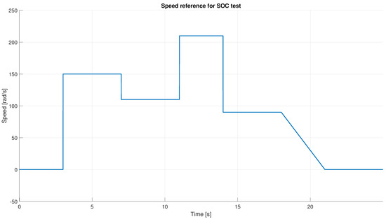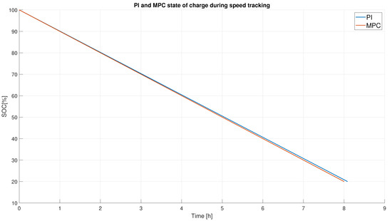 The last experiment consisted of a large test where the state of charge (SOC) of the lithium-ion batteries was observed. For this experiment, the induction motor velocity profile shown in Figure 15 was chosen and repeated in time until the batteries reached 20% of charge. This is the minimum value at which batteries should be maintained to extend their lifespan [40]. Figure 16 shows the SOC of the battery throughout the experiment, where the differences between the two designed controllers can be observed. In the first 3 h, the difference cannot be distinguished, but after the SOC reaches 60%, the MPC’s SOC starts to extend above the PI line. At the end, the PI reaches 20% of the SOC after 8 hours, while the MPC has 20.835% left. This translates into 5.07 min more driving time.
