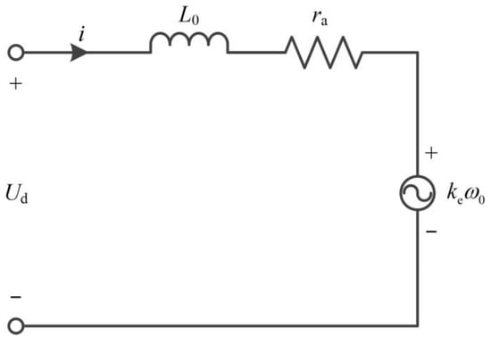 where Ud is the DC voltage, ra is the winding line resistance, satisfying ra = 2R; L0 is the winding equivalent line inductance, satisfying L0 = 2(L − M); ke is the line back-potential coefficient, satisfying ke = 2pψm; p is the pole logarithm of the motor; ψm is the maximum value of the permanent magnet flux linkage in each phase winding; ω0 is mechanical angular velocity of the motor.