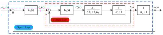 According to Equation (10), the BLDC motor can be expressed by two series inertial elements. Since the compensator studied in this paper is used in the inner current loop of the control system, the equivalent system structure diagram of the BLDC motor can be finally determined based on Equation (10) and Figure 3, as shown in Figure 4.