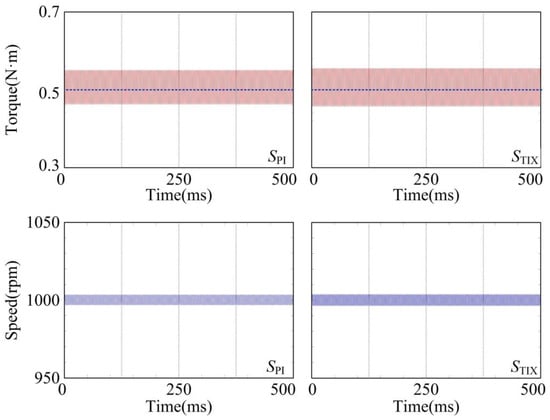 Next, to verify the robustness of the proposed controller to the noise of the current sensor, when the motor is in a steady state, it is assumed that the current sensor receives an external noise interference of 0.01 s at 0.5 s. At this point, the speed and torque graphs of SPI and STIX are as shown in Figure 14; thus, in terms of speed, the designed infinity norm compensator can suppress speed distortion amplitude by about 9.6%, and can recover to normal more quickly after the noise disappears. In terms of torque, the designed infinity norm compensator can also smooth torque fluctuations and has a faster response speed. Therefore, the PI-H∞-MIX control strategy exhibits good control performance.