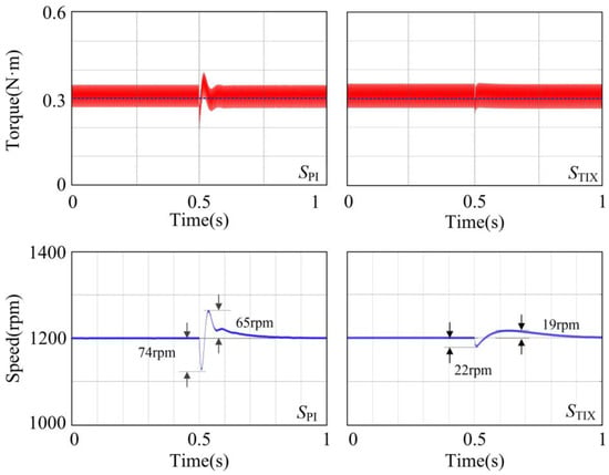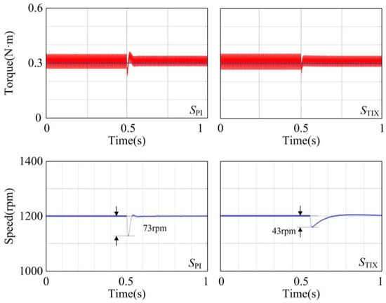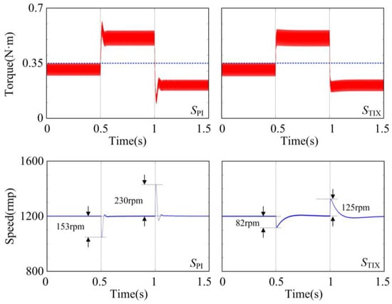 When the motor load increased, the speed fluctuations of SPI and STIX were 153 rpm and 82 rpm, respectively. When the motor load reduced, the speed fluctuations of SPI and STIX were 230 rpm and 125 rpm, respectively.