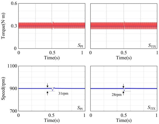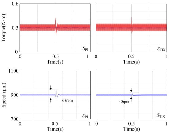 Initially, the motor is set to run smoothly at a speed of 900 rpm with a load of 0.3 N·m. At the 0.5 s mark, it is assumed that the Hall sensor receives an external noise interference of 0.01 s. At this point, the speed and torque graphs of SPI and STIX are as shown in Figure 13. As shown in Figure 13, in terms of speed, the designed infinity norm compensator can suppress speed distortion amplitude by about 40%, and can recover to normal more quickly after the noise disappears. In terms of torque, the designed infinity norm compensator can also smooth torque fluctuations and has a faster response speed. Thus, the PI-H∞-MIX control strategy has good robustness under the influence of the Hall sensor noise.