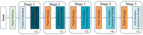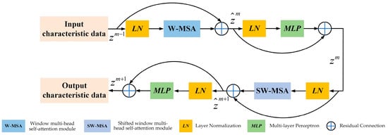 where , , and , respectively, denote the input of the previous layer, the output of the current layer, and the output of the next layer within the Self-attention Calculation Module of each stage. LN contributes to regularization and model training optimization, ultimately enhancing performance and stability. Residual connections are utilized to address the issues of gradient vanishing and information loss. MLP enhances the expressive power of the network through nonlinear transformation.