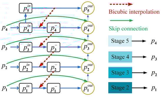 In the top-down, we employ bicubic interpolation as a smooth and accurate interpolation method, which has been widely used by researchers [18,19]. Therefore, we employ bicubic interpolation to perform quadruple up-sampling, leveraging the continuity and connectivity between pixels to enhance image resolution and mitigate the impact of noise. Specifically, bicubic interpolation calculates interpolation weights based on the distance between the interpolation point and its 16 neighboring pixels, reflecting the contribution of these nearby pixels to the interpolation point. By taking a weighted average of the neighboring pixels, an estimated value for the interpolation point can be obtained, thus achieving image up-sampling. Through the gradual restoration of image details and clarity via quadruple up-sampling, BFE-Net generates higher-quality, high-resolution images. Specifically, we up-sample through bicubic interpolation, and then splice it with in the channel dimension to obtain , which is a richer feature representation. Next, we up-sample through bicubic interpolation, and then splice it with in the channel dimension to obtain . Similarly, we can obtain and in turn. In the above process, BFE-Net realizes feature fusion, which fuses higher-level with lower-level features to improve perception and anti-interference capability.