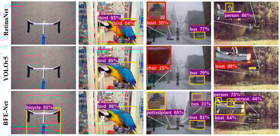 As can be seen from Figure 6, the detection accuracy of BFE-Net for bicycle, bird, bus, and boat is significantly better than that of the comparison algorithms, RetinaNet and YOLOv5. In terms of overall network, compared with other algorithms, BFE-Net draws on the idea of the Swin Transformer in feature extraction, which effectively captures the global and local information in the image through the window self-attention mechanism, thus improving the object detection performance. Additionally, BFE-Net constructs a feature pyramid with bidirectional information flow, facilitating the fusion of multi-scale features and further boosting detection accuracy. Lastly, is used in the classification regression network to optimize the movement direction of predicted bounding boxes, leading to improved localization accuracy. In summary, during object detection visualization, BFE-Net consistently outperforms typical algorithms, proving its effectiveness in delivering superior accuracy and efficiency in a wide range of object detection tasks.