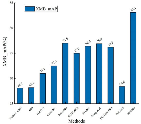 Many algorithms have poor detection accuracy for small objects, and small objects may even be missed and wrongly detected due to the small-sized object samples in the PASCAL VOC2017+2012 dataset, such as bird, boat, bottle, and television. To address this, BFE-Net improves its algorithmic structure to enhance the detection accuracy of small objects. For feature extraction, BFE-Net uses a window-based self-attention mechanism that adaptively focuses on important regions in the image, especially the local regions where small objects are located, improving the perception of small objects. For feature fusion, the bidirectional information flow within the feature pyramid structure allows the fusion of features from different levels, enabling the network to better capture the feature information of multi-scale objects. This helps BFE-Net handle small objects and improve the detection accuracy. Moreover, the adoption of optimizes the movement directions of predicted boxes, ultimately enhancing the detection performance for small objects. BFE-Net specifically considers bird, boat, bottle, and television as small object categories, and the mAP is 83.1%, surpassing other comparative algorithms. This demonstrates BFE-Net’s effectiveness in detecting small objects and addressing the challenges presented by their presence in the dataset. As a result, BFE-Net is a reliable choice for object detection tasks where small object detection is of critical importance. This performance is illustrated in Figure 7 (created using Origin 2018).
