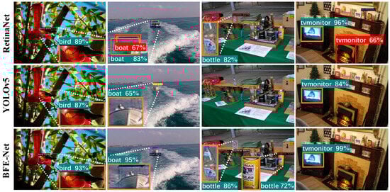 As shown in Table 1, BFE-Net exhibits a high level of detection accuracy for most object classes in the PASCAL VOC2007test dataset, with mAP reaching 85%. Compared to the typical algorithms RetinaNet and YOLOv5, BFE-Net demonstrates 4.2% and 2.3% increases in mAP, respectively. When compared to the latest algorithms SFGNet and DC-CenterNet, the mAP of BFE-Net is an improvement by 3.7% and 3.4%, respectively. For a visual representation of BFE-Net’s object detection capability, we randomly selected several images from the PASCAL VOC2007test dataset and conducted a comparative analysis with RetinaNet and YOLOv5 to highlight the differences in detection, as illustrated in Figure 6.