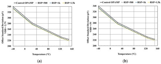 Figure 11b, where typical process variations are implemented, no major shift in the offset distribution can be spotted, with the waveforms being approximately the same, with a variation of a few µV for each individual case: 281.8 µV vs. 281.1 µV (control op-amp and RSP included), 225.4 µV vs. 224.6 µV (