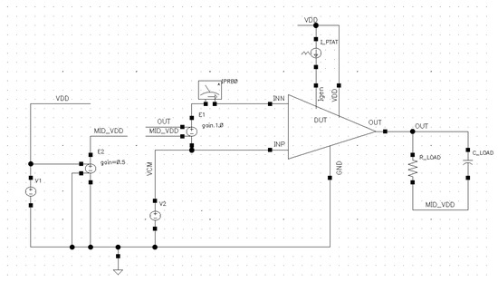 The testbench utilized to evaluate the operational amplifiers’ current-mirror source degeneration DC parameters studied in this paper (such as the offset voltage, CMRR, PSRR, quiescent current) is presented in
