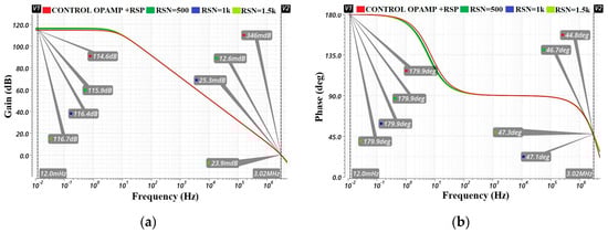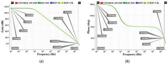 Figure 10a,b present the gain and phase margin waveforms for the control op-amp and the three implemented pMOS degeneration resistor values.