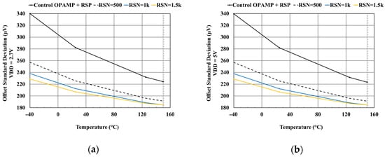 Figure 12a,b. As can be seen from the graphs listed below, all of the chosen resistor configurations minimize the standard deviation fluctuations compared to the op-amp in which only