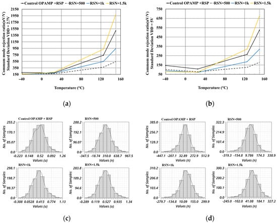 Figure 12c,d illustrate the Monte Carlo histograms considering the control op-amp with pMOS source degeneration implemented and the three resistor values implemented above at room temperature and both supply voltages for the CMRR. The IC designers must choose a compromise between the offset voltage and CMRR, depending on the application’s environment and conditions in which the amplifier is to be used.