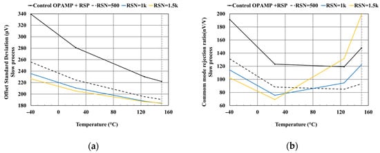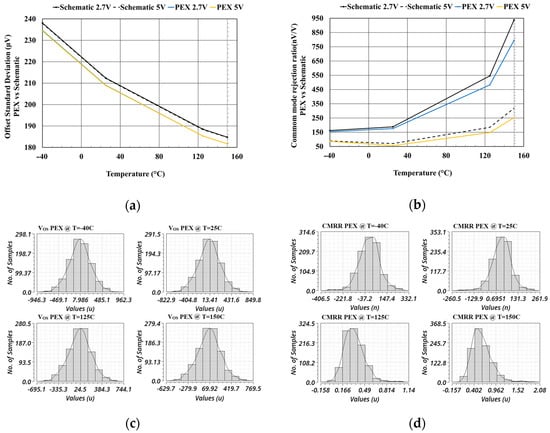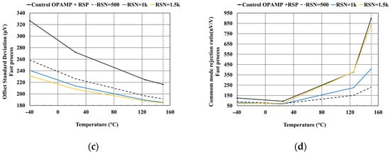 Figure 11b, the offset voltage standard deviation graphs are approximately the same as in the slow-corner process, with a variation of a few µV for each individual case. Considering that the differential pair’s source-gate voltage is reduced in this corner, the common-mode rejection ratio is automatically impacted, with a higher standard distribution obtained for all temperatures, compared with