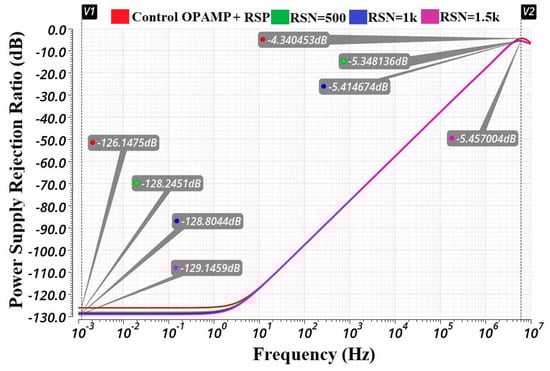 Table 3. As the frequency increases, the waveforms overlap. The lowest PSRR results are obtained at around −5 dB, but at a frequency much higher than the amplifiers’ unity-gain bandwidths. The values reached for low frequencies are −128.28 dB (