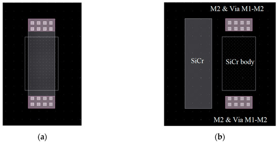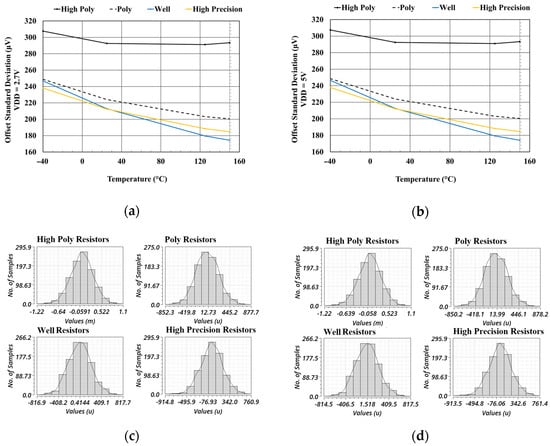 Section 2.3, it was stated that state-of-the-art high-precision thin-film resistors (silicon–chromium as the metallic alloy), which have better matching than other resistor types, were implemented to achieve an offset voltage reduction. To support the high-precision source degeneration method presented in this work and the benefits to the operational amplifier’s performance, a comparison using three other resistor types (high-poly resistors, poly resistors and well resistors) was made. The same width was kept for all resistors; thus, a comparison between the resistors’ die areas could be made. The models accompanying these SiCr resistors have been measured and verified in other developed ICs. The results obtained for the offset voltage are presented in