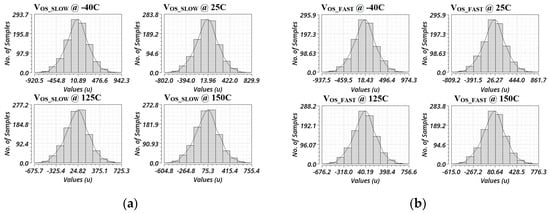 Figure 17c for a typical corner, a gradual increase in the mean and the standard deviation values, applicable to all temperatures, is evident. At room temperature, the standard deviation fluctuation is imperceptible (207.21 µV slow vs. 208.86 µV typical vs. 210.73 µV fast), and for the mean values, the maximum variation is 13.54 uV. However, it is known that the two-stage operational amplifier with a folded cascode presents a systematic offset due to the unbalanced voltages in the folded stage. The highest mean values are found at 150 °C, regardless of the simulation corner.