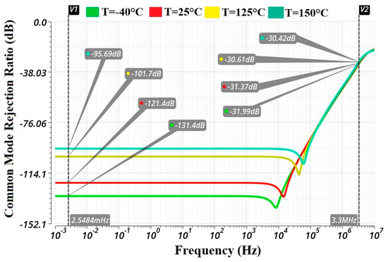 The common-mode rejection ratio with PEX at different temperatures versus frequency is presented in