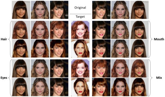 Synthesis results obtained for each conditional facial region extracted from the original images, wherein the original and target images are depicted in the top row and middle column, respectively. The remaining images were produced by modifying the styles corresponding to a specific region of the target image from the original image for each part. The proposed approach was implemented.