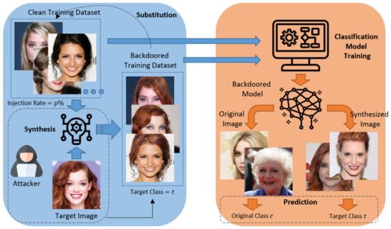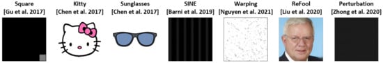 In general, this approach follows the principles of BadNets [], which generates a backdoored model and activates a misbehavior depending on a specific condition caused by injecting backdoored images containing the pattern intended by the attacker into the training set. This pattern is called a backdoor trigger, and it varies, e.g., a set of specific values of each pixel [,] and a character [,]. In addition, the attacker modifies the labels of the backdoored images in the training dataset as the desired target class. After training, the backdoored model classifies the input data containing the backdoor trigger into the target class intended by the attacker. The threat posed by backdoor attacks to face classification models is increasing, and such attack techniques have been proposed in several studies [].