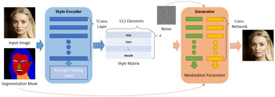 First, it extracts feature values for each facial region using a per-region-style encoder. Thus, a -dimensional style matrix is obtained, where s represents the number of semantic regions in the image, and each vector per s is generated by network block TConv-Layers via a region-wise average pooling layer. The generated per-region style matrix and segmentation mask of the input image are input into a generator, and they are passed through two separate convolutional networks. In addition, the output parameters are used for training the generator. The final trained generator produces a reconstructed input image using the style matrix of the original input image.