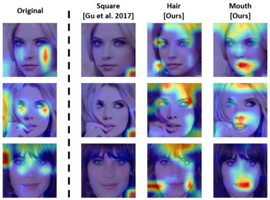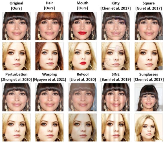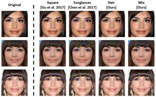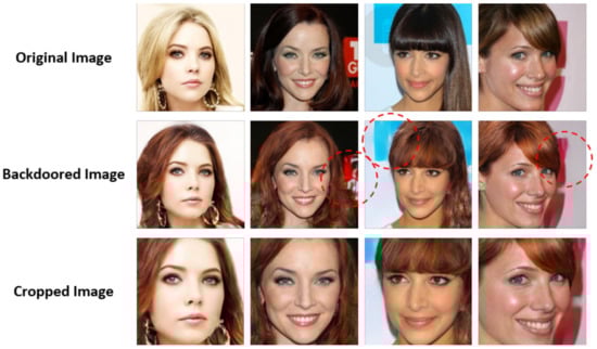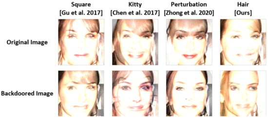 Regarding the facial recognition domain, researchers attempted accessories-trigger-based backdoor attacks []. In addition, Xue et al. [] proposed a black trigger that can be concealed in eyebrows and beards. However, the former technique requires the removal of accessories for face recognition in the physical world, and it has limitations owing to the highly similar trigger locations caused by capturing all images at similar angles and brightness levels []. The latter technique is difficult to apply to images of women in the case of a beard trigger.