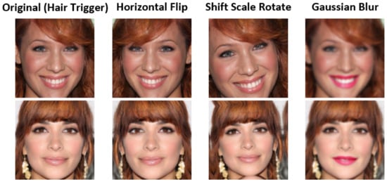 Nevertheless, backdoor triggers in the facial image domain are limited, because they are conspicuous or perceived as unnatural by most individuals. If a specific pattern irrelevant to the face is attached to the facial images [], it can be easily noticed by the defender. In prior studies [,], a trigger with a fixed shape, size, and location for each image was employed. However, these attacks can be easily detected by image spatial transformation-based defense methods [] such as horizontal flipping, cropping, and resizing. If the backdoored images that have triggers at fixed locations (e.g., lower right) [] or specific triggers overlaid on fixed regions [] are reversed or rotated, the attack cannot be activated, because the property of the trigger location is completely destroyed. In other cases, the attacker uses image warping [] or a specific perturbation [] as a trigger; if certain noise is injected into the backdoored image and disturbs the pattern, the attack performance can be significantly degraded. Therefore, such backdoor attack approaches should be more resistant to image-transformation techniques.