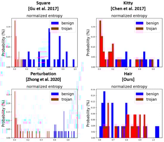 Entropy distribution of original (benign) and backdoored (trojan) images for each backdoor trigger [,,].