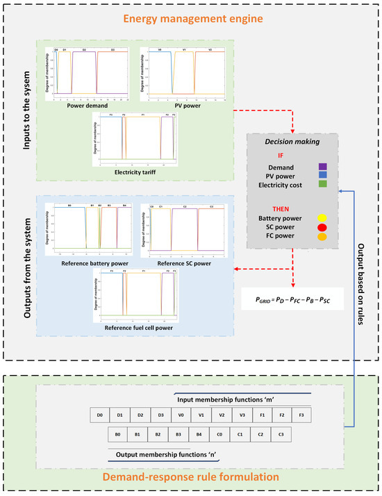 The presented system generates power from a PV source operating at its maximum power point along with the FC operating as the primary source supplying power during low power demand. Illustrated in Figure 1, the output from PV is controlled with a DC–DC buck–boost converter capable of stepping up or down the output voltage according to the power absorbed by the conventional load. The battery and SC work together as the supplementary sources charging and discharging accordingly, i.e., absorbing or providing power. To regulate the DC bus voltage, the FC is connected to a boost converter to step up the output voltage, and the battery and SC are interfaced with buck–boost converters for the bi-directional flow of currents to allow their charging and discharging. Presented in Figure 2 is the rule-based energy management algorithm adopted in this framework to generate the power references for the BSMC [40]. It is the secondary-level control in an SoS framework responsible for generating the power references to be tracked by the primary-level controller. This approach employs fuzzy-logic rule-based EMS which takes input power from the converters and generates the output reference power for the FC and hybrid energy storage system, according to the designed rules.