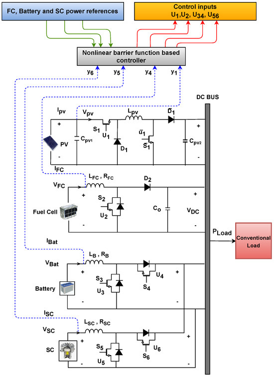 To design a robust nonlinear controller that possesses the characteristics absent in the previous works, i.e., dealing with uncertainties and disturbances without exceeding the controller gain boundary values, a barrier function dependent sliding mode controller (BSMC) [39] has been implemented in this work to control the output power from PV, the FC, the battery and the SC through the connected DC–DC converters working in a grid-connected mode to fulfil the load demand from the conventional load in the presence of disturbance and uncertainties. The schematic of the system under study is presented in Figure 1. As the PV system supplies intermittent power, the FC is considered the main source with the battery and SC acting as the auxiliary sources.