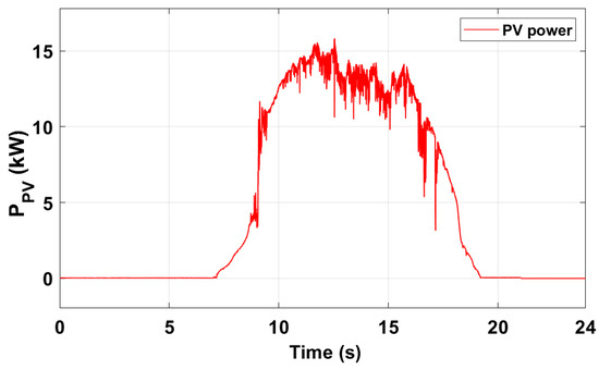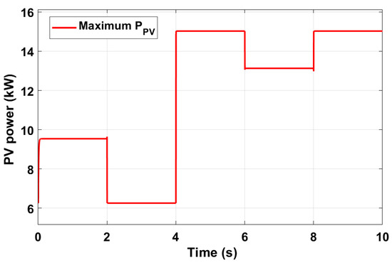 The power provided by the PV system is presented in Figure 4 under varying irradiance and temperature conditions operating at its maximum power point (MPP). Since this is the only stochastic energy source in this system, the additional power is now supplied by the remaining energy generation and storage sources. Figure 5 illustrates the power provided by the SC along with the role of the BSMC and SMC in tracking the reference power. Initially, at t = 0 s, the SC is charged during comparatively low power demand, after which its active performance can be observed as it discharges during high power transients or remains idle accordingly. At the same time, one can also observe the efficient working of the BSMC in tracking SC power to its reference over the STSMC, which displays several overshoots and undershoots.