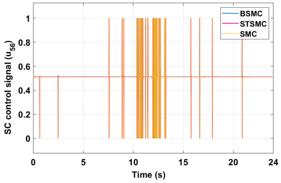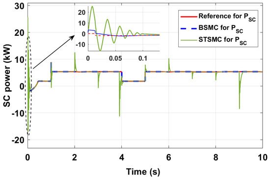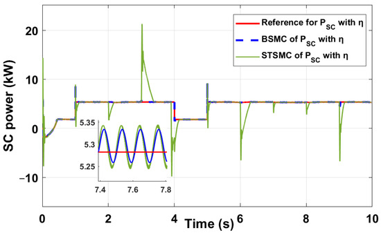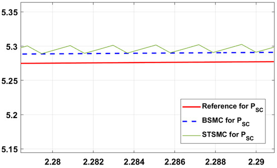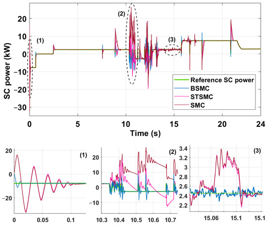One of the objectives of this work focused on the reduction in chattering exhibited by most of the sliding mode controllers. To verify it, the phenomenon of chattering displayed in the SC’s response with the BSMC and STSMC is presented in Figure 6. As the SC is responsible for providing power during high power transients, it is affected the most during external disturbance, which can be observed in the form of sinusoidal movement of the state trajectory. It can be observed that while the STSMC displays noticeable chattering in its tracking, the BSMC effectively minimizes the chattering close to almost negligible in this case.