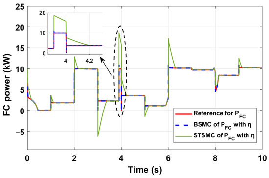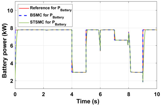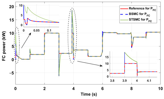 The power provided by the battery to charge the SC under varying power demand conditions is displayed in Figure 7. Under high power demand, the battery supports SC by discharging depending on its state of charge (SoC). In this case, both the BSMC and STSMCs exhibit similar performance but with a delayed steady-state response by the STSMC. Figure 8 shows the overall contribution of FC power. Since it is the main source responsible for keeping the battery and SC charged, the FC always provides variable power to maintain the power balance, during which the BSMC plays an important role. The main objective of designing a power management system and controllers is to regulate the DC link voltage portrayed in Figure 9. The VDC reference is set to 400 V, and the tracking of both controllers is illustrated in the graph. It is worth noticing their transient responses in which the STSMC exhibits a peak voltage of 421 V, whereas the BSMC shows a negligible peak.