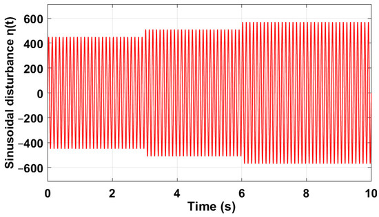 In the upcoming results, the performance exhibited by both controllers is displayed in the presence of a sinusoidal disturbance with a varying amplitude shown in Figure 10. This induced disturbance in the study represents a disturbance with an unknown upper bound, which might affect the states due to some parametric variations in the inductor, capacitor or resistor values over time, or it can be a disturbance due to some external environmental factors. It can be mathematically modeled as: