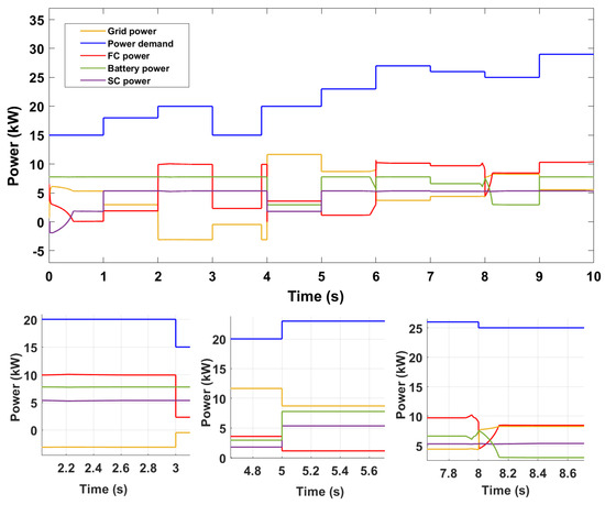 In Equation (64), is the power that is taken from the grid or provided to the grid. , and are the power provided by the FC, battery and SC, respectively. As given in Equation (65), power demand PD can display two cases: it can be negative when is sufficient to meet the load requirements, and the additional power can be either provided to the grid or consumed to charge the battery/SC. On the other hand, can be positive, which means that the additional power to fulfil the load demand is supplied by the HESS, FC and grid. The FC, battery and SC combine to fulfil the power demand in the following pattern: