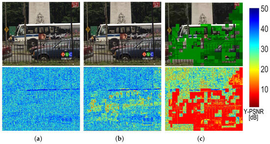 - Discarding All EB: In this scenario, evident in Figure 3b, the frame exhibits regions with diminished Y-PSNR. This decrease is predominantly observed in areas undergoing pronounced color transitions, typically indicative of movement.
